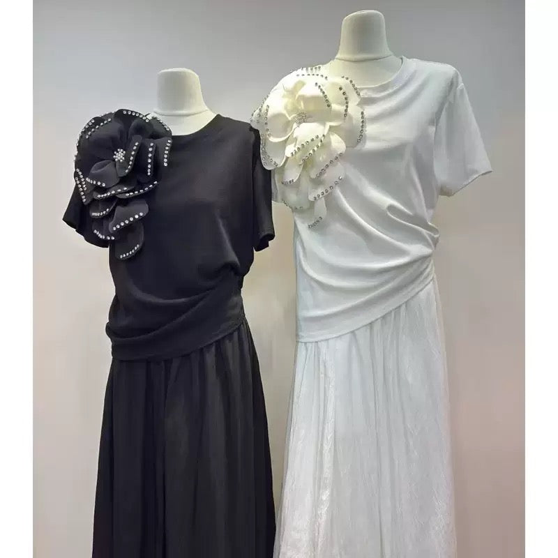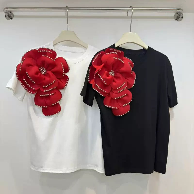 Algodón con aplicaciones de rosas en 3D y pedreria de cristales. Talla Única