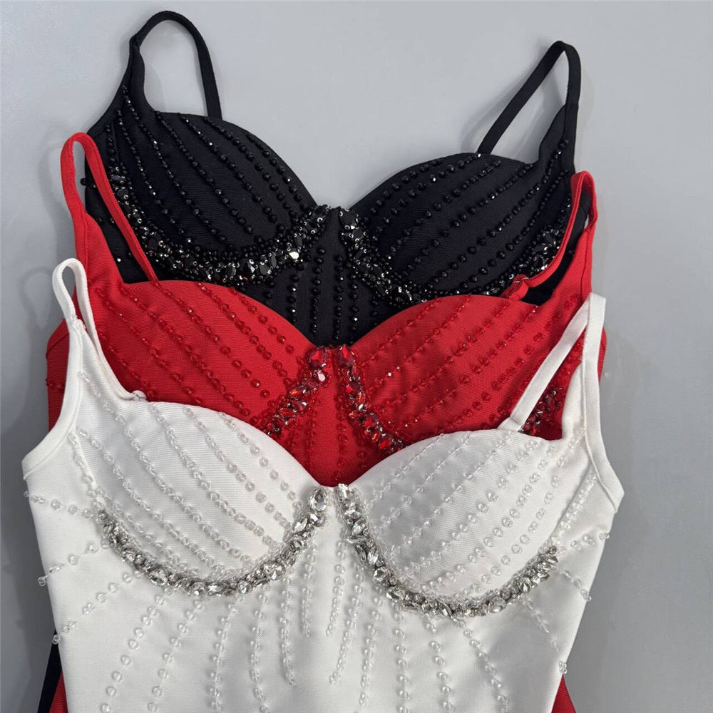 Cuenta con incrustaciones de pedrería en el pecho, copas incorporadas y tiras regulables para un ajuste ideal. Su abertura posterior en las piernas brinda comodidad y movimiento, mientras que su diseño elegante y sofisticado lo convierte en la opción perfecta para eventos especiales.