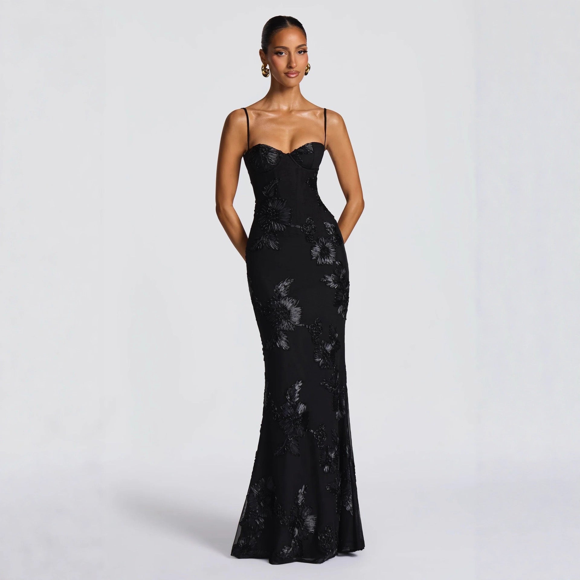 El corset ajustable en la espalda se adapta a tu figura, realzando la silueta con un fit estilo sirena que abraza suavemente el cuerpo antes de abrirse con un movimiento elegante.