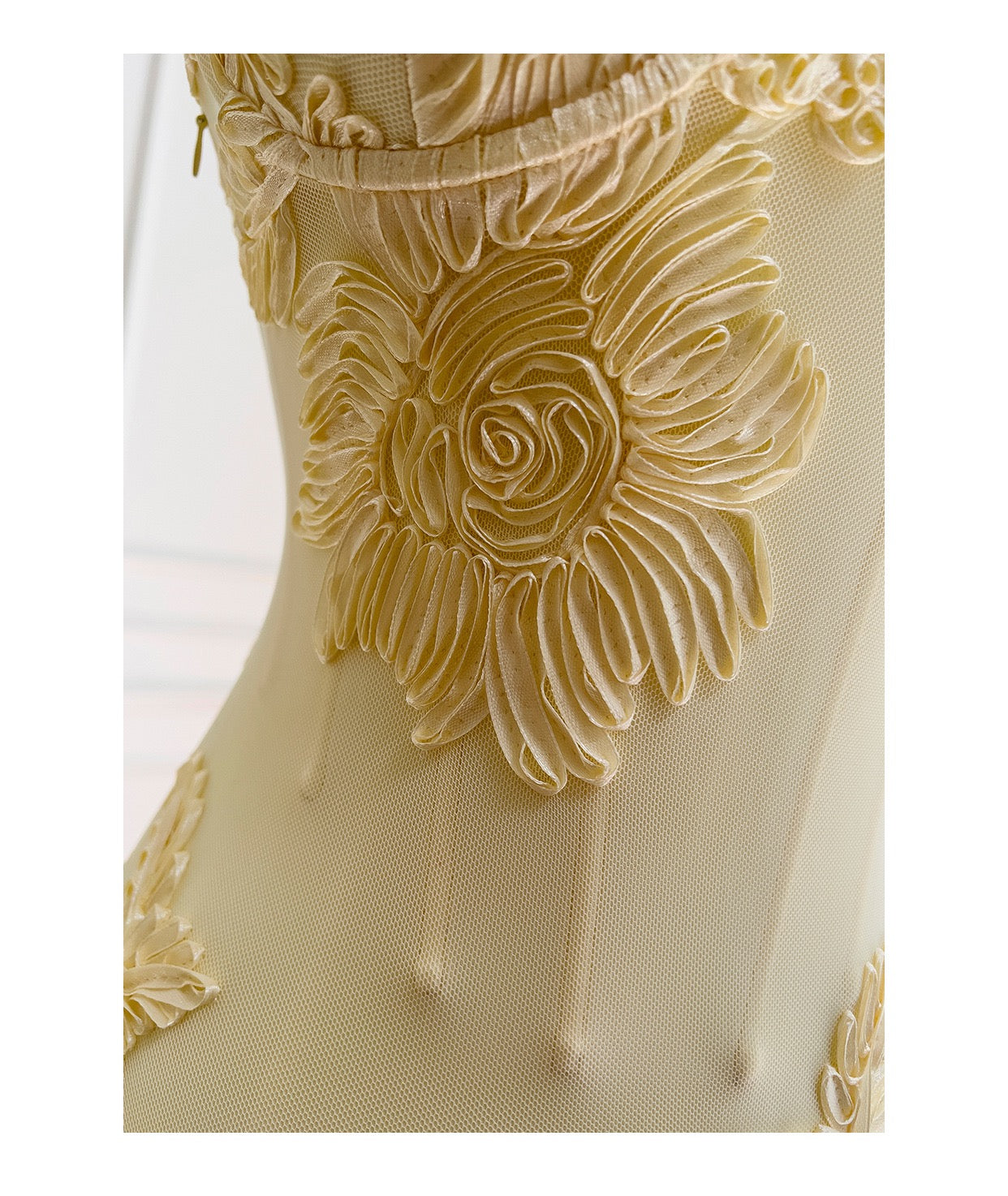 Diseñado en tul bordado con relieve tipo soutache, su textura en flores en 3D captura cada rayo de luz, creando un efecto etéreo y sofisticado.